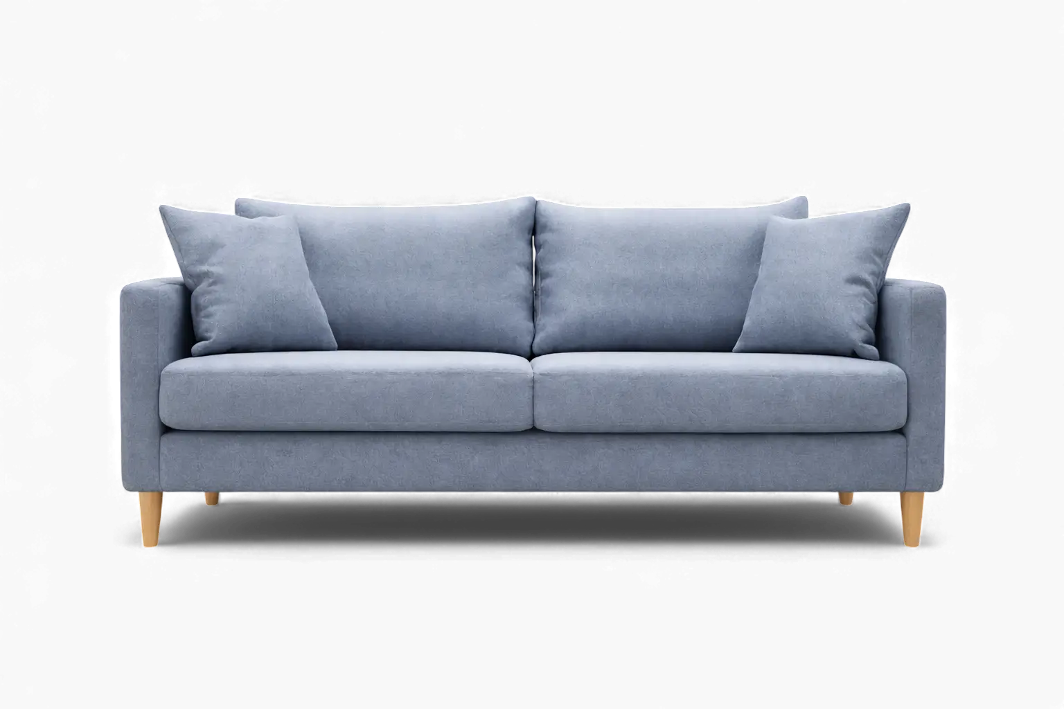 Tall blonde timber legs elevate the sofa visually and physically, creating a light, airy aesthetic with a distinct Scandinavian influence. The raised frame also allows for easy cleaning underneath, ideal for commercial use.